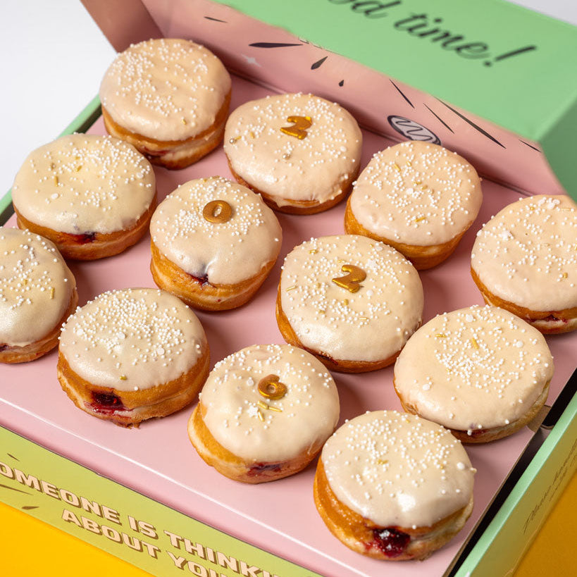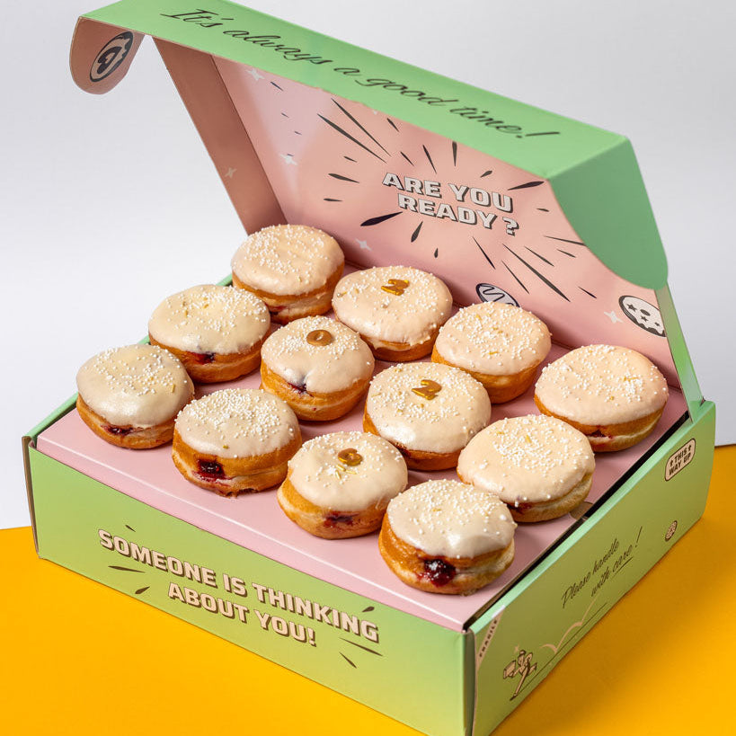 Unsere Doughnuts werden am Versandtag frisch gebacken, von Hand verziert und sorgfältig in unseren Geschenkboxen verpackt. Somit bleiben die Doughnuts bis zu vier Tage frisch und genießbar.