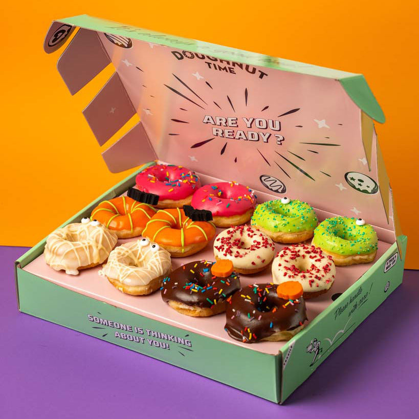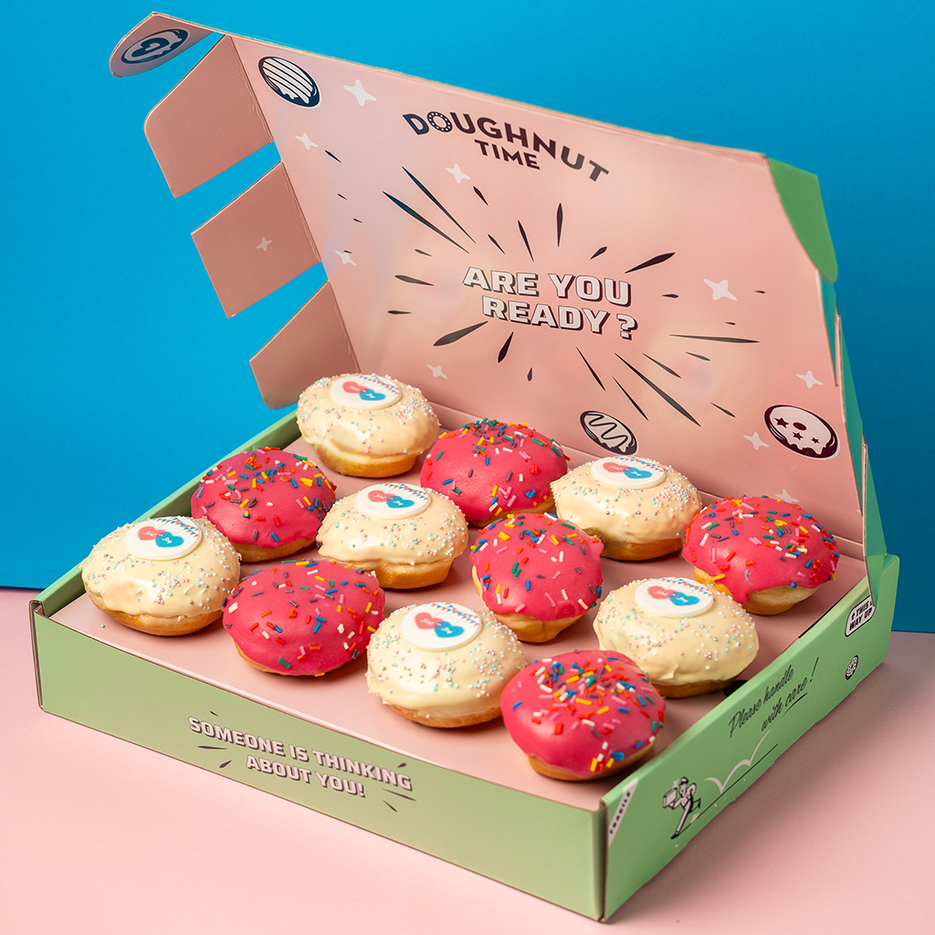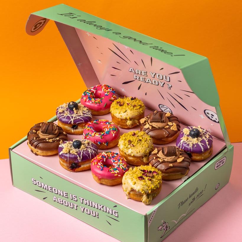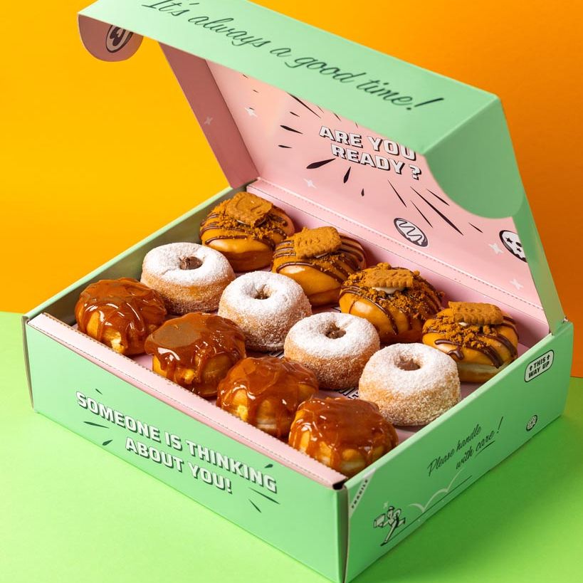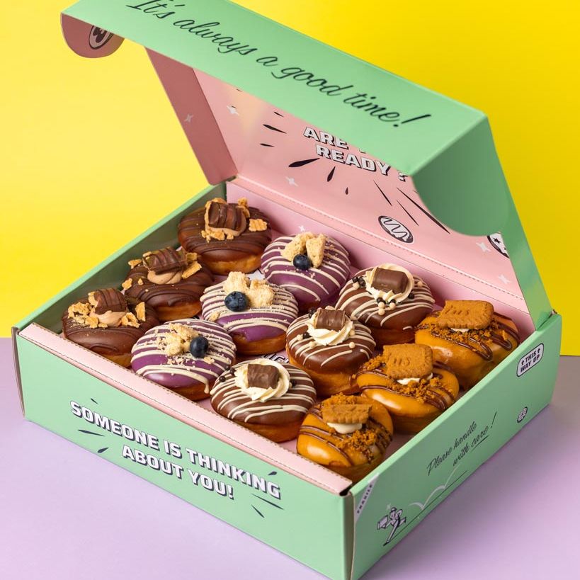 Immédiatement après la fabrication, nos donuts sont envoyés par courrier express. Notre boîte cadeau spécialement conçue les garde frais !