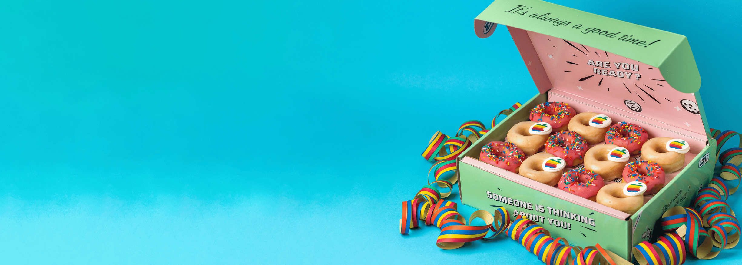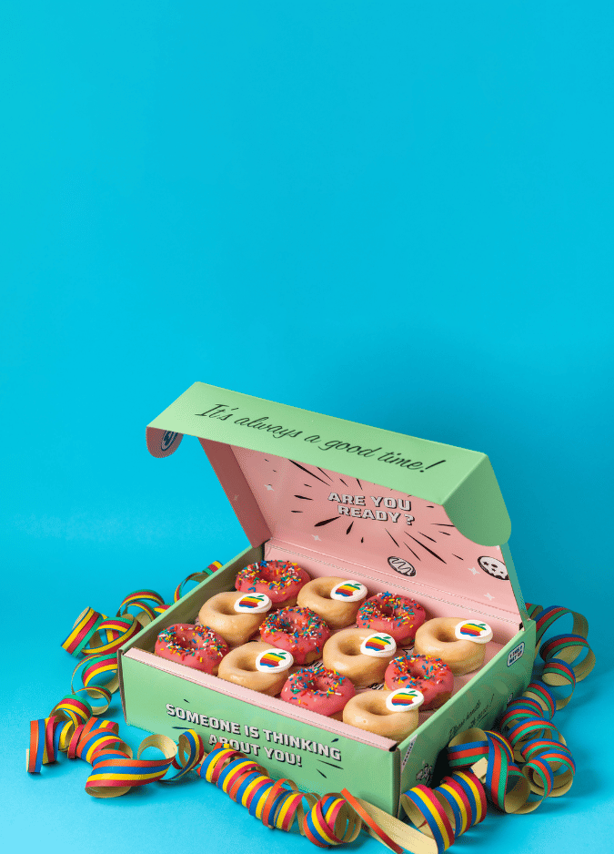 Saremo lieti di aggiungere alle ciambelle un topper commestibile con il tuo logo, abbinato al colore della glassa. È possibile anche personalizzare la confezione.